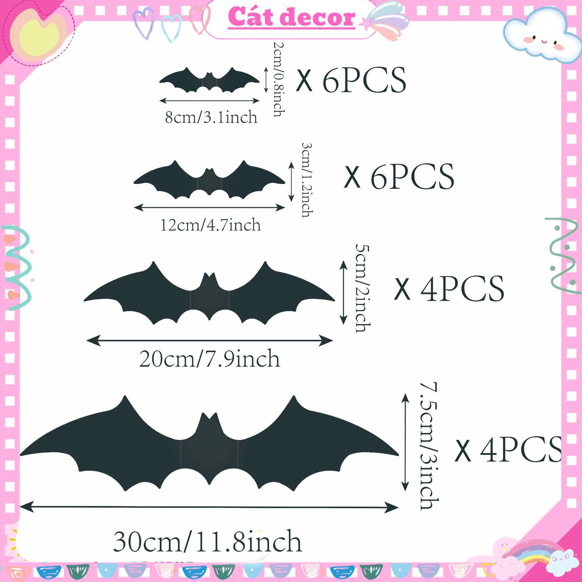 “Dơi dán 3D” là những mô hình dơi được làm từ nhựa mỏng, có thể dán lên tường, kính hoặc trần nhà để trang trí, đặc biệt là trong các dịp lễ hội như HalloweenChúng thường có thiết kế cánh gấp, tạo hiệu ứng như đang bay và có thể phản quang để tạo thêm hiệu ứng ma quái, rùng rợn.